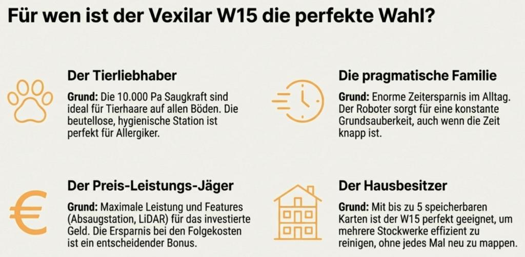 Der Vexilar W15 punktet vor allem beim Preis-Leistungs-Verhältnis. Die extreme Saugkraft (10.000 Pa – mehr als doppelt so stark wie der N8 Pro+!) und die beutellose Station sind echte Killer-Features. Er ist 100-200 € günstiger als die Konkurrenz, spart zusätzlich Folgekosten und bietet mit 5 Kartenspeichern die meisten Etagen-Optionen.